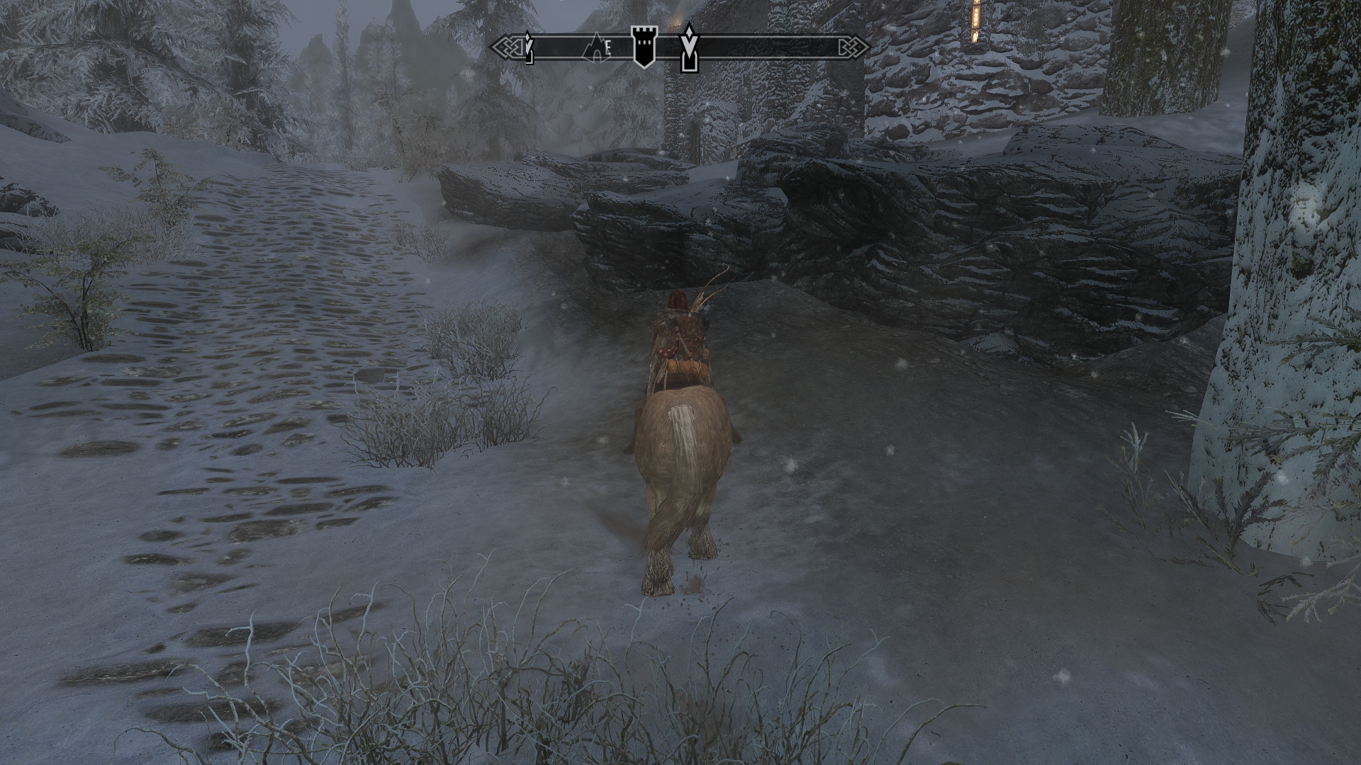 As we ride higher into the hills, the wind rises and it starts to snow. Soon the icy flakes are falling thick and fast, and in minutes the road ahead is obscured by a shifting curtain of white. I’m hopeful that we’ll have to abandon the mission due to inclement weather, but just as I’m about to suggest that we turn around and head back to Helgen, we find our destination. Hard as it is to believe, for once I’m not eager to take shelter from the cold.