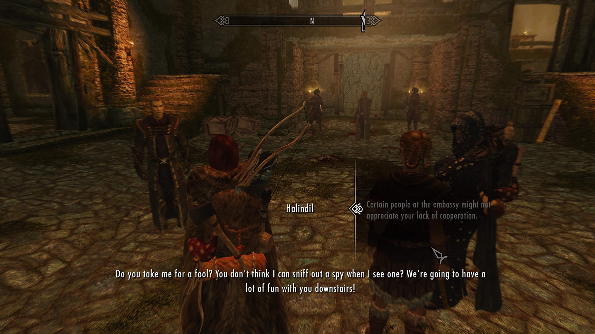 I’m very close to responding in this sarcastic fashion to his inane query — but since we happen to be surrounded by several military veterans in full armour with lots of pointy weapons, I manage to bite my tongue. However, he’s clearly expecting an answer, and since we were speaking earlier with Delphine and her plans to infiltrate the embassy, I blurt out something about spying on the Thalmor.