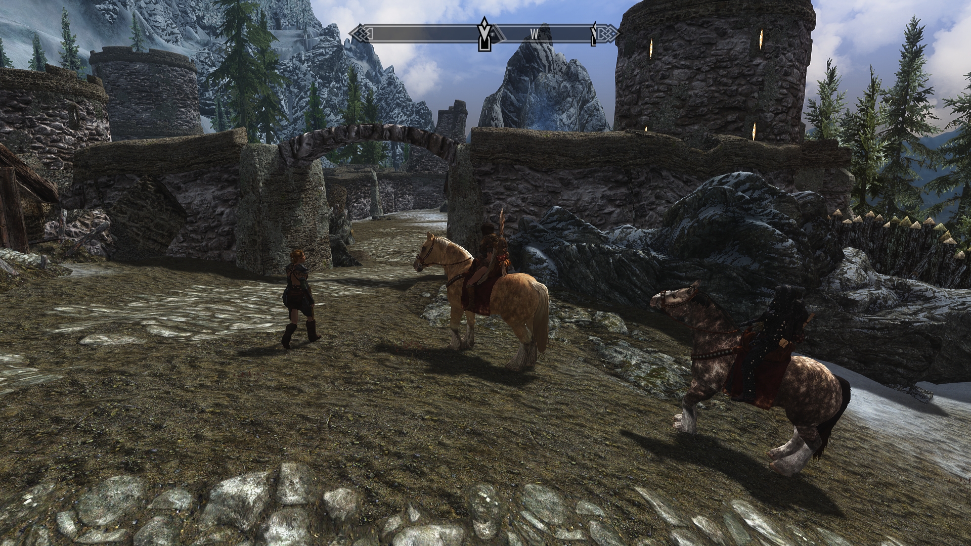 Jenassa and I leave the sparkling river behind and pass the trio of standing stones as we continue on our way to Helgen. As we ride higher into the hills, I gradually become aware of a distinct chill in the air and a thin layer of snow on the ground. Ahead, the blackened walls of the ravaged town stand out against the sky, much like an ancient Nord ruin.