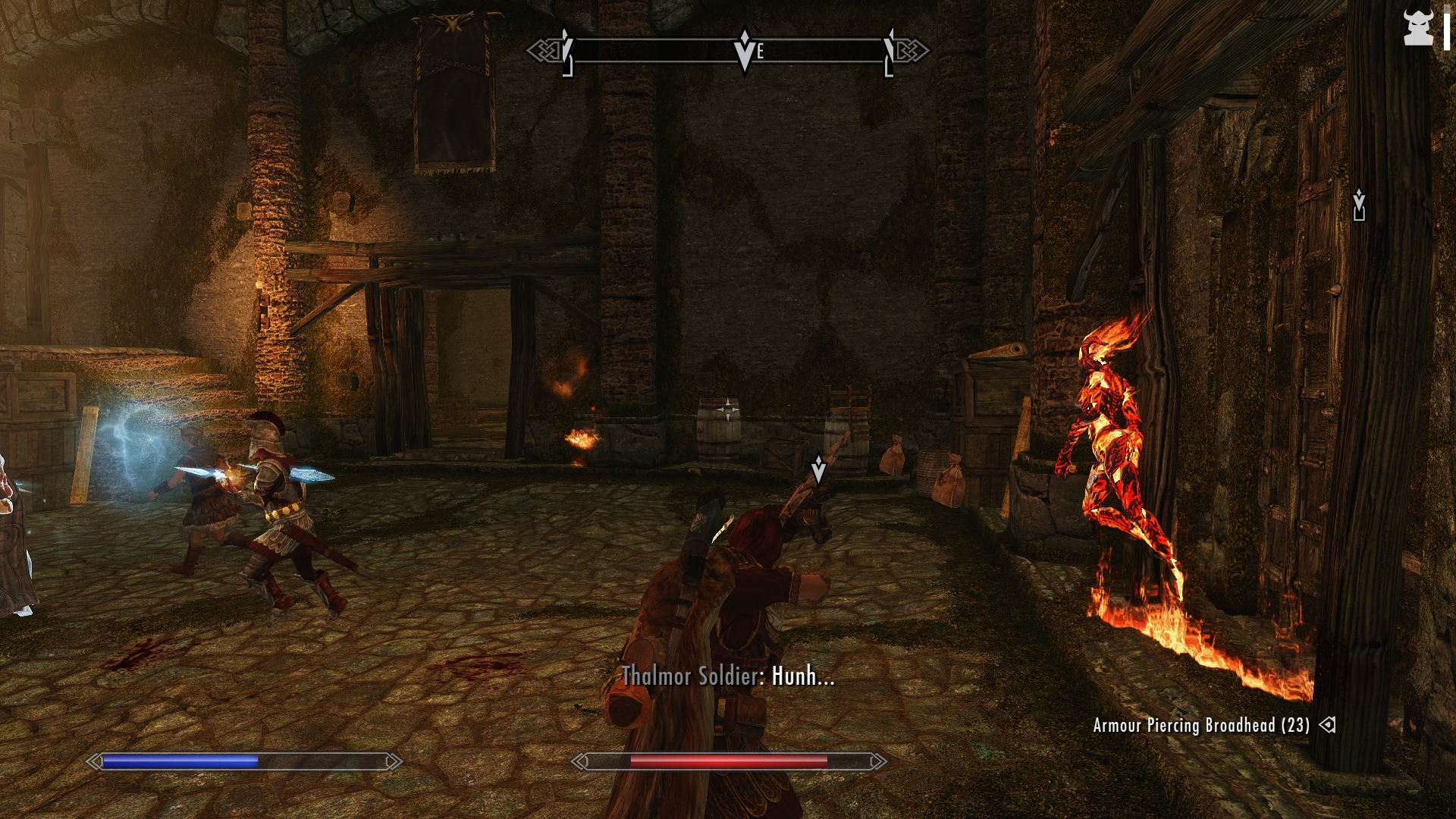 These Thalmor are no joke. Spells are flying everywhere, the Justiciar is behind a wall of guards, and more enemy soldiers are rushing in from every direction. Fortunately our allies seem to be veteran fighters, and all I can see of Jenassa is a whirling blur of blades. In minutes, we’ve cleared out a large space and pushed most of the Thalmor toward the back of the room. I resummon Barbie and pull out my bow, picking off any new Thalmor that try to enter the fray while my allies battle their way to the Justiciar.
