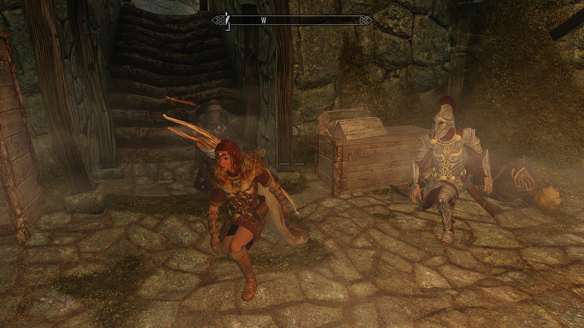 Choosing a likely direction, we work our way through the lower floors, relying on stealth and surprise to dispatch the remaining Thalmor. The narrow passageways actually work to our advantage, as we encounter small groups of no more than two or three at a time, making our task much easier. Soon it becomes a relatively simple matter of picking off the less observant guards with our bows, and rushing down with our blades anyone still left standing.