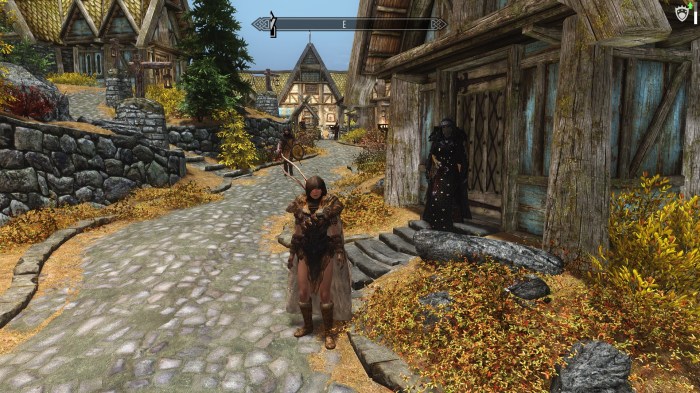 But when the skies finally clear and the sun shows its face once again, my wife and I prepare to go back on the road. We haven’t forgotten our promise to confront the Alik’r on Saadia’s behalf, and the date of the reception at the Thalmor Embassy is fast approaching as well. Lucia is touchingly sad to see us go, and clings to us both as we say our goodbyes, making us promise to return safely. Our capable housecarl assures us that our house and daughter will be under her constant supervision, and with a final round of farewells, Jenassa and I step out into the bright morning sunshine.