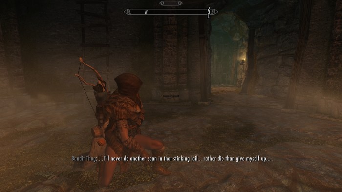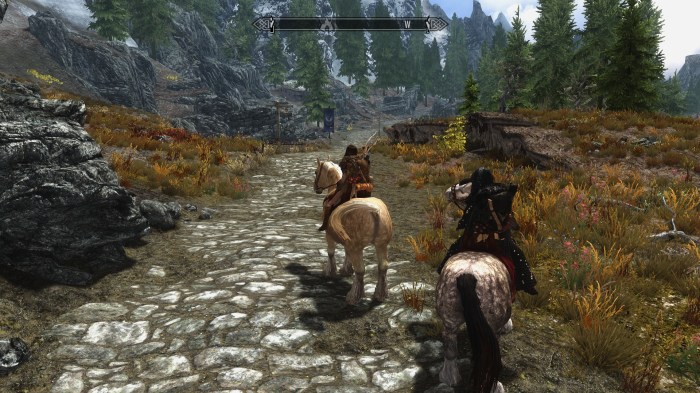 Riding westwards with the sun warm on our faces, Jenassa and I head out from Fort Greymoor and resume our journey to Swindler’s Den. The road is clear and empty, save for the occasional wildlife crossing, and fortunately we don’t encounter any more crazed bandits spoiling for a fight. As we reach the border of Falkreath Hold, we slow our pace and start looking for a narrow dirt path in the long grass. There are rumours of giants in this area, and the last thing we need is to find ourselves overly close to their encampment.