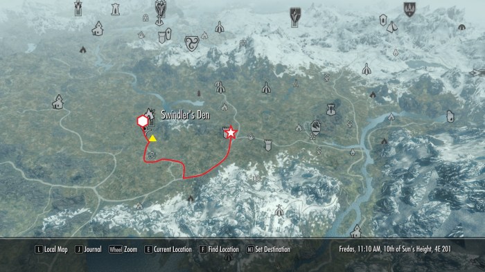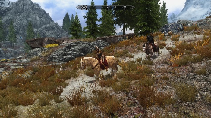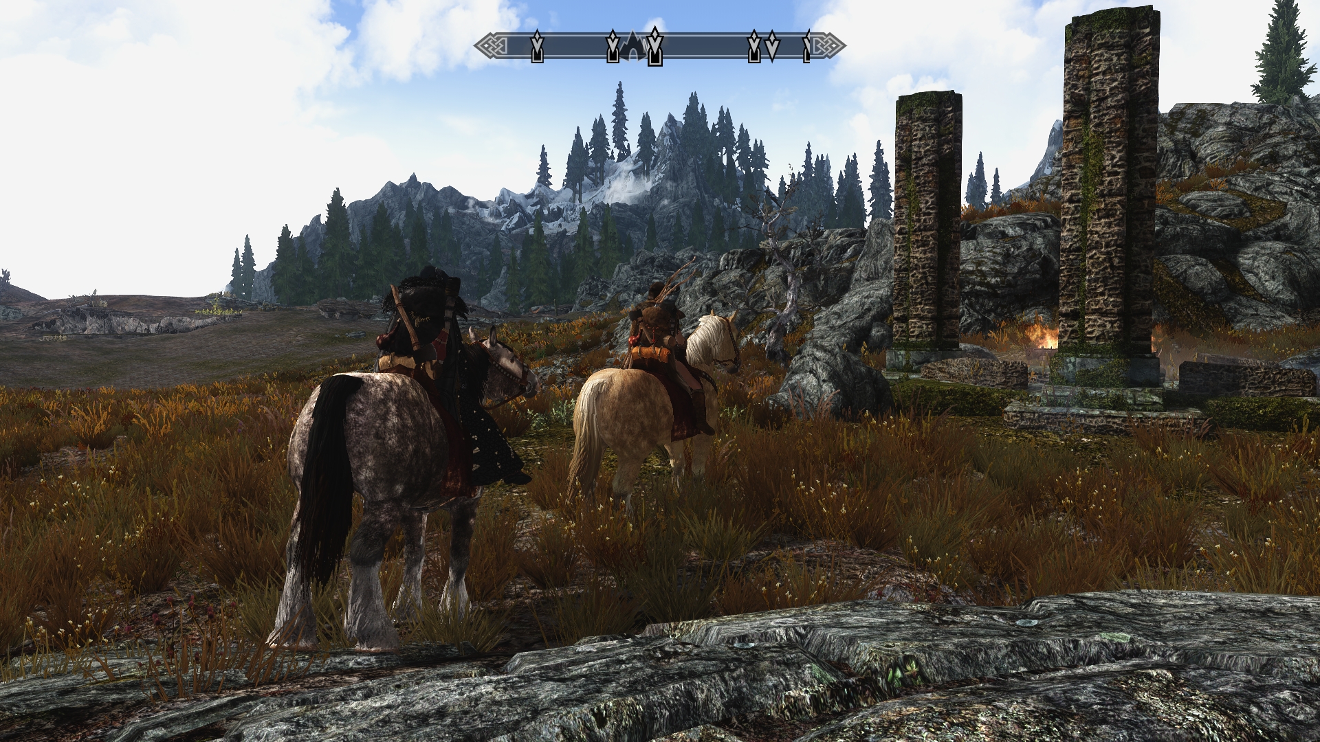 Riding westwards with the sun warm on our faces, Jenassa and I head out from Fort Greymoor and resume our journey to Swindler’s Den. The road is clear and empty, save for the occasional wildlife crossing, and fortunately we don’t encounter any more crazed bandits spoiling for a fight. As we reach the border of Falkreath Hold, we slow our pace and start looking for a narrow dirt path in the long grass. There are rumours of giants in this area, and the last thing we need is to find ourselves overly close to their encampment.