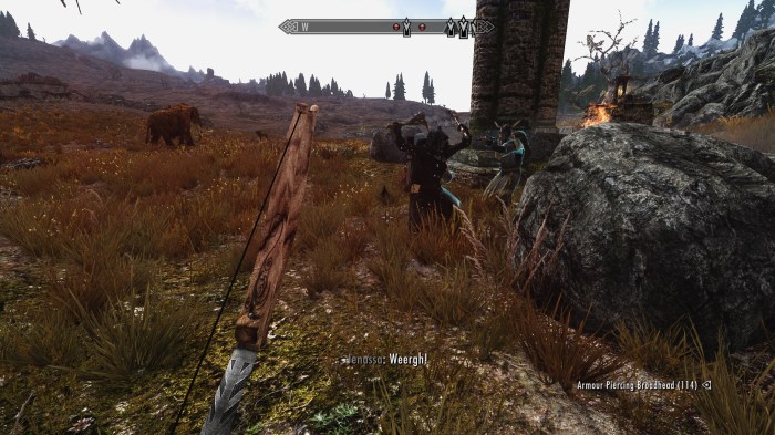 Eventually we discover the path and ride north into the plains, past an ancient stone circle and a minor scattering of Nordic ruins. A herd of mammoths up ahead gives us a fair idea of where the giants are located, and we briefly leave the path in order to avoid any unfortunate territorial misunderstandings.