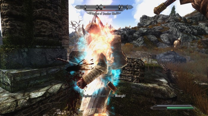 Startled by the sudden attack, our horses sprint a short distance away while Jenassa and I swiftly reach for our weapons. Expecting our assailants to belong to Kematu’s band of Alik’r, I’m disappointed to discover that they’re actually elite Vigilants of Stendarr. Well, “disappointed” isn’t quite the right word. “Dismayed” might be closer to the truth, especially as they fight just as zealously as the other pair of Vigilants who once invaded our Falkreath homestead. However, my wife is more than equal to the challenge — and I’m more than happy to help her out.