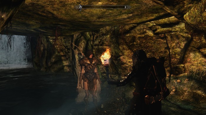 As soon as she hears someone speaking to me from the other side of the waterfall, Jenassa grabs my arm and hauls me toward her. Startled, I nearly lose my footing on the wet stone as I’m suddenly dragged backwards, but despite this I’m grateful for her fast reaction. Besides Kematu’s voice, we can detect other sounds echoing in the cavern ahead, revealing that our quarry is surrounded by at least half a dozen men — and all of them know exactly where we are.