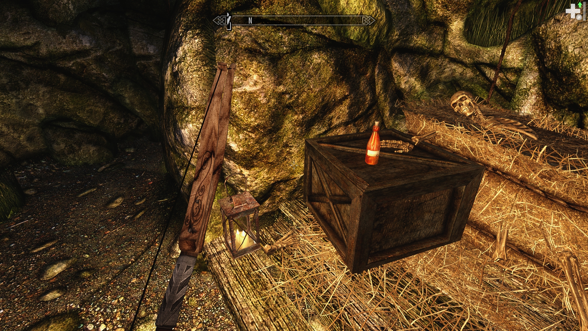 Like many caves in Skyrim, this one appears to be a series of variously-sized chambers connected by long, narrow tunnels. After we clear the first chamber of bandits and loot, we notice a target dummy off to one side. Several iron arrows protrude from the dummy’s chest. Normally this would be a sign of excellent target shooting — but in this case, not so much, since there’s also a ripe apple balanced on top of the dummy’s head. Unless the bandits were deliberately trying to miss the apple, I’m feeling pretty confident about our chances.