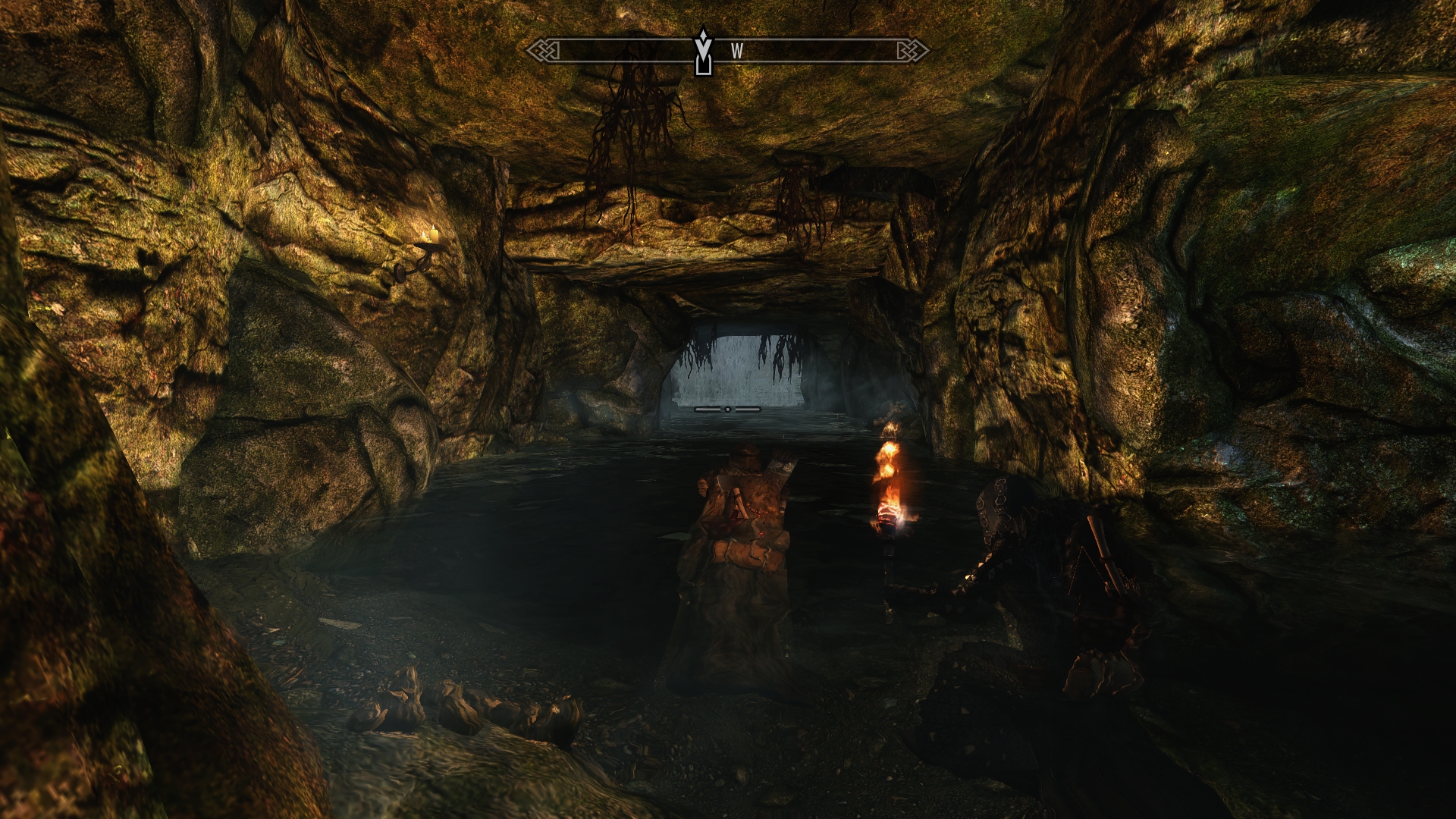Jenassa and I glance at each other in surprise when the scent hits our nostrils, unsure what to make of this discovery. Intrigued, we disable the traps and push forward into the passage — and soon we find ourselves immersed up to our armpits, slowly wading through a dark flooded tunnel. Behind me, Jenassa holds the torch aloft so we can see where we’re headed, and the flickering flame causes the cavern walls to shimmer in an eerie dance of light and shadow. Since holding our weapons is pointless when we’re half-submerged in water, we concentrate on traversing the flooded section as quickly as possible.