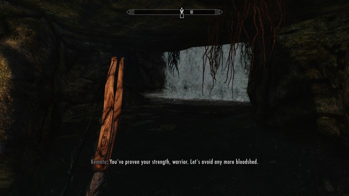 Even if our informer was telling the truth, you’d think it would make more sense for Kematu to remove his warriors to another location after the first one was captured. At the very least, the Alik’r must know that they aren’t exactly on good terms with the Whiterun guards — reason enough to find some other hideout, perhaps in another Hold altogether. In a province that seems to have more ruins and fortresses than citizens, you’d think that holing up with a bunch of low-life bandits in a musty cave would be a last resort.