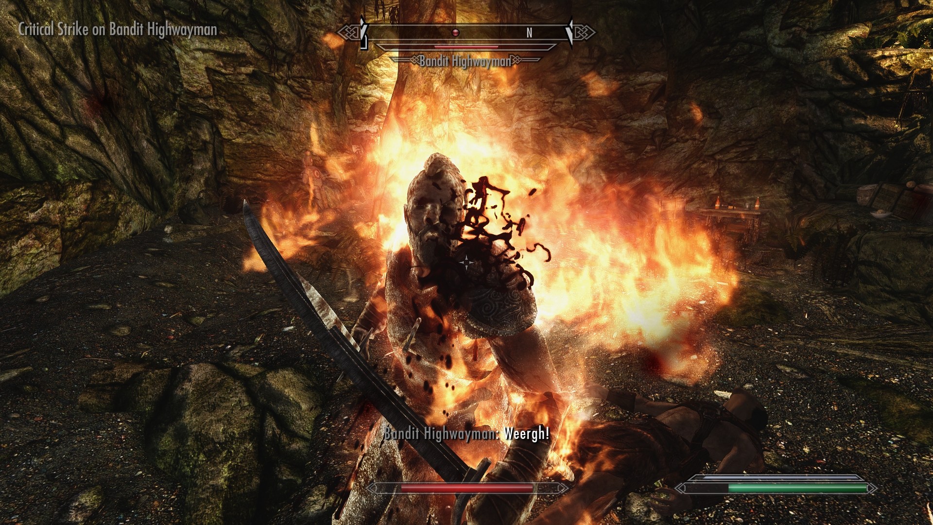 The insightful bandit immediately realizes there are intruders about — clearly the man is a genius compared to his generally dimwitted colleagues — and with a cry of fury he charges toward us with a sword in each hand. By sheer instinct, I deflect his savage attack with my shield — then I reach for Dawnbreaker and slash him hard across the chest. At once he’s wrapped in Daedric flames, and his cries rapidly change from rage to terror. I must admit, even after all this time, witnessing that panicked reaction is still deeply satisfying.