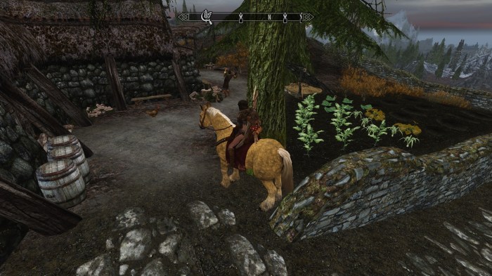 I’m ruminating on these gloomy thoughts when I spot a substantial and comfortable-looking farmhouse near the road, and I slow down for a closer look. This place is easily comparable to the commodious farms of Rorikstead, and quite a bit better than most. I notice someone outside chopping wood near the house, and on the spur of the moment, I guide my horse into the farmyard. I’m hoping that I can speak to the owner, and see if Jenassa and I can make an arrangement to stay here overnight, in case the rain catches up to us and we’re forced to turn back. At any rate, I figure it couldn’t hurt to ask.