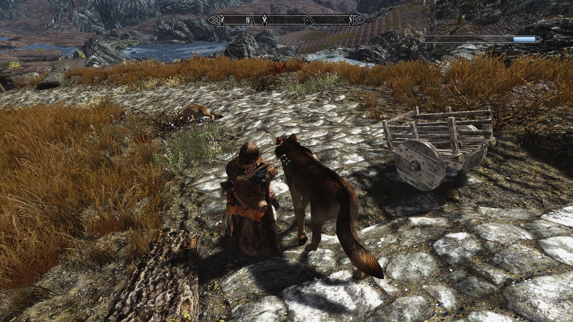 But when we reach the road, someone appears to be waiting for us. A large wolf reveals itself from the long grass and watches our approach, with a calm demeanour that could rival the serenity of a Greybeard. The horses are instantly on the alert, unwilling to get any closer to the predator — but something in the proud animal’s behaviour tells me that it wants to communicate with us. Well, more specifically, with me. Wolf-to-wolf. Werewolf-to-wolf. Whatever.