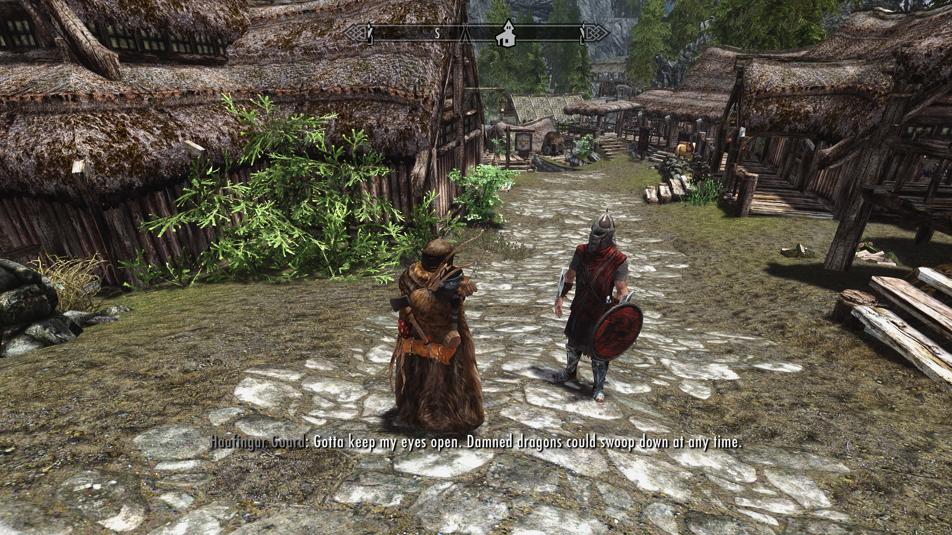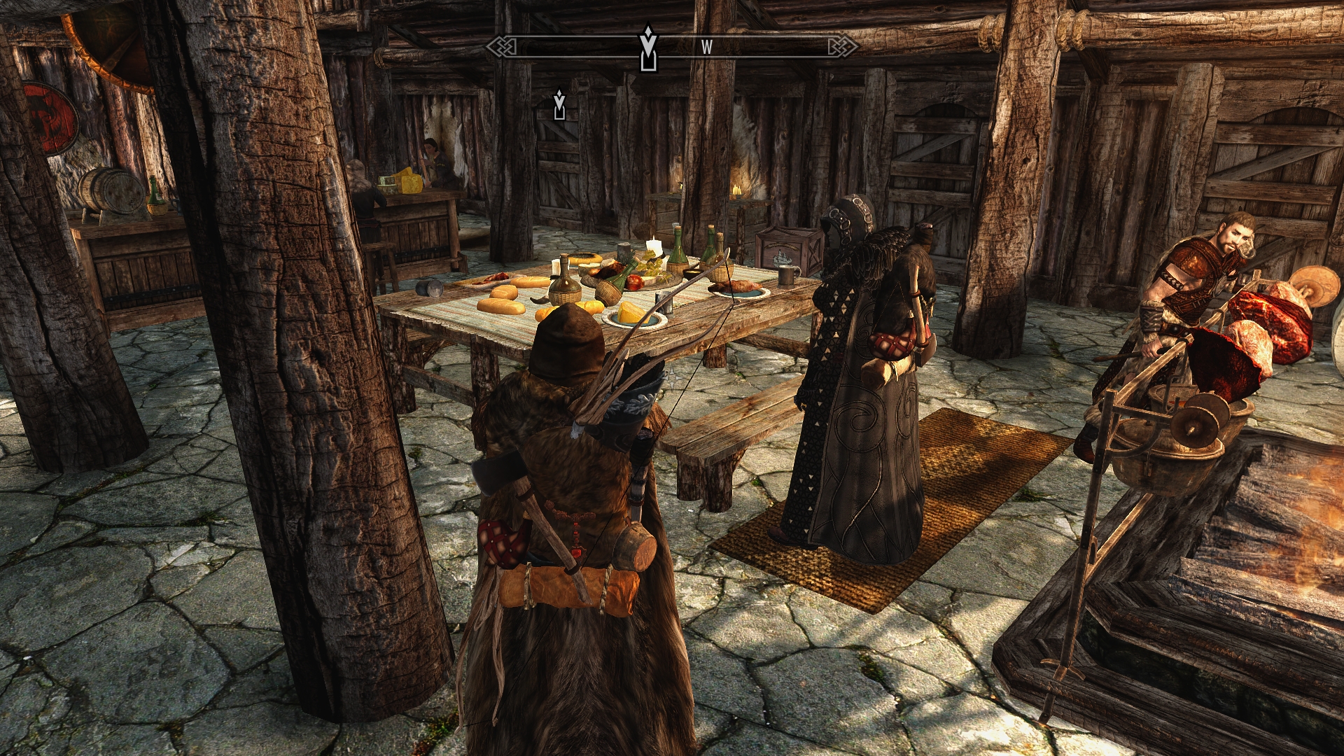 Mind you, this makes it hard to respond coherently to all the relieved residents of Dragon Bridge, who start arriving a few minutes after I sit down. Despite the early hour, it seems that half the town has decided to show up to the inn and thank us heartily for slaying the dragon. Needless to say, our breakfast takes quite a long time as a result.