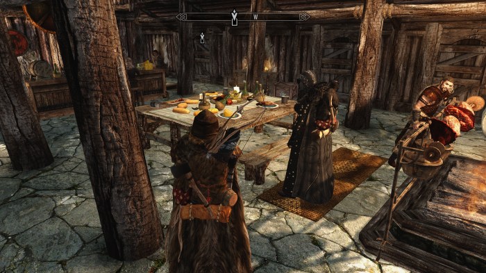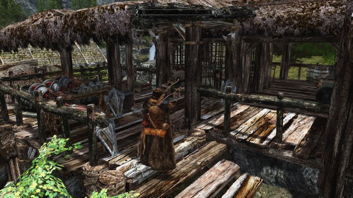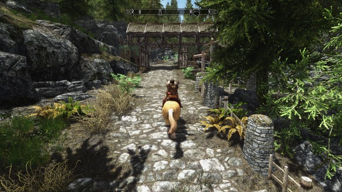 Crafting completed, Jenassa and I gather our belongings and head outside. It’s true that the town of Dragon Bridge isn’t all that big, but while I was simultaneously trying to eat, talk, have my hand shaken and my back slapped (why do people even do that?), my wife was making some inquiries about the local services.