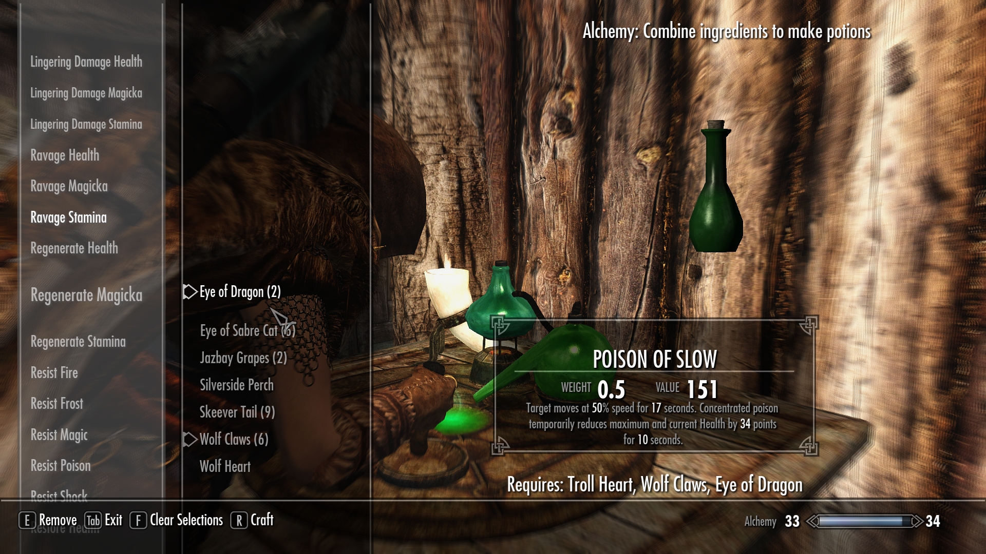 Eventually, Jenassa manages to remind me that our stock of potions is running pretty low. Fortunately I’ve been collecting fresh materials as we travel, so I have plenty of ingredients with which to experiment. So as the innkeeper starts clearing the dishes and shooing our fan club out the door, I stand up and make my way to the back of the inn, where a handy alchemy table is set up for general use.