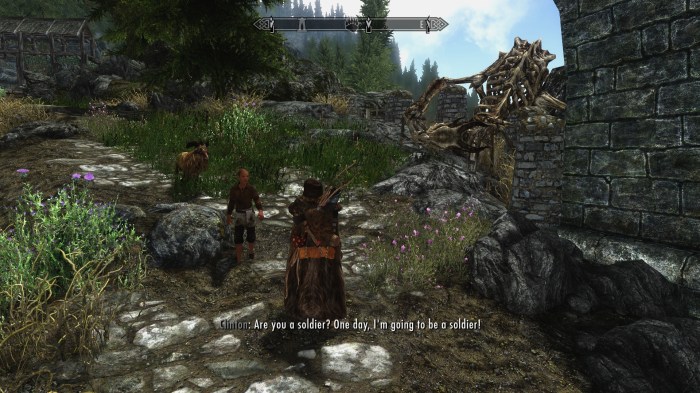 Finally the boy stops for breath, and we manage to ask for directions to the general store. As we do so, I can’t help but be reminded of Rorikstead. Funny how the shops in these small settlements are so hard to find. I guess if the store is simply part of a house, and everyone already knows where it is, then there’s no obvious reason to make it more… well… obvious.