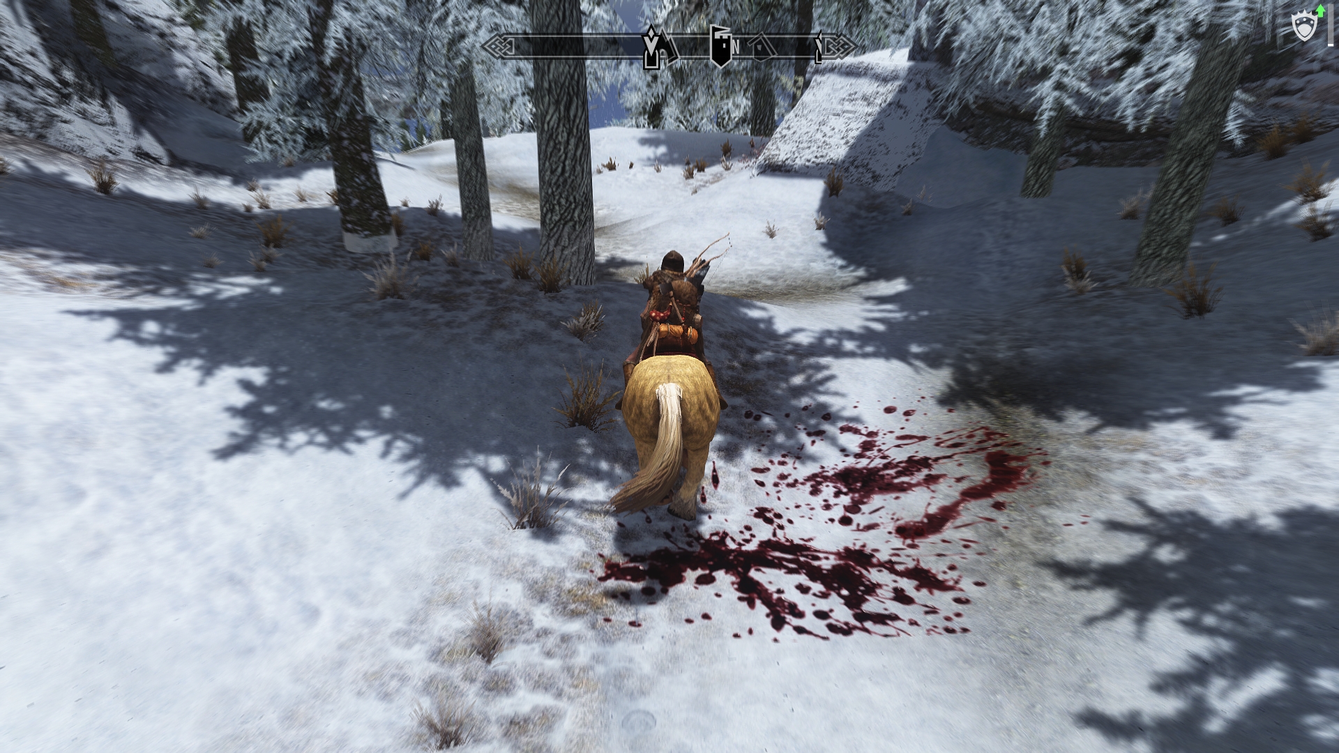 In my preoccupied state, I’ve been letting my horse meander around the area while I wait for Jenassa to catch up, trusting that he won’t wander too far away from the road. But suddenly the reins are almost yanked from my hands as Frost tosses his head with a jerk, backing himself up and nearly colliding with Jenassa’s horse, who whinnies indignantly at us. As I struggle to regain control over my mount, I glance down to see the remains of a stag just off the road, with a gory trail of blood leading off into the woods.