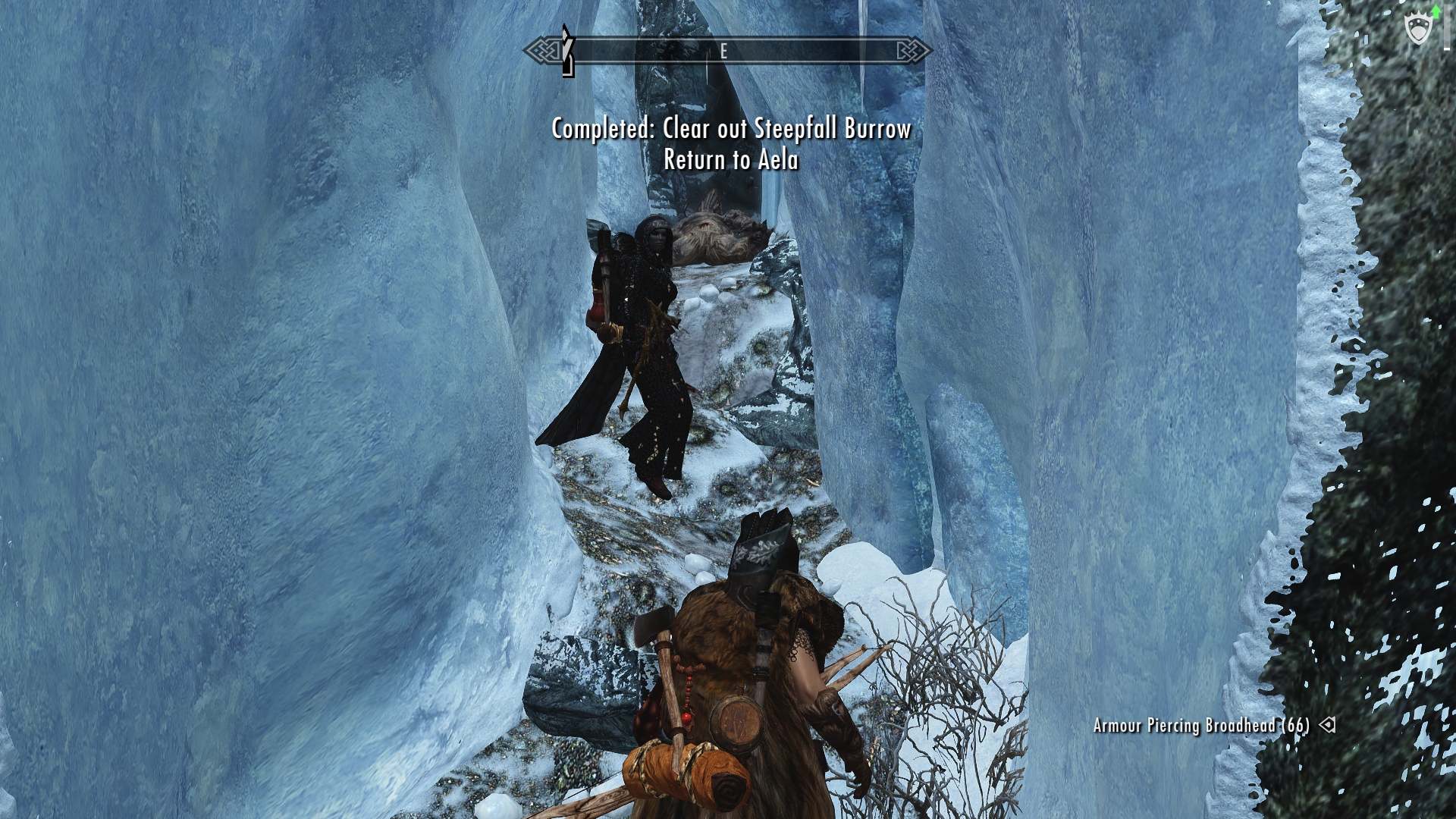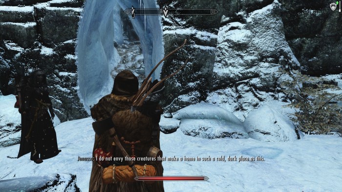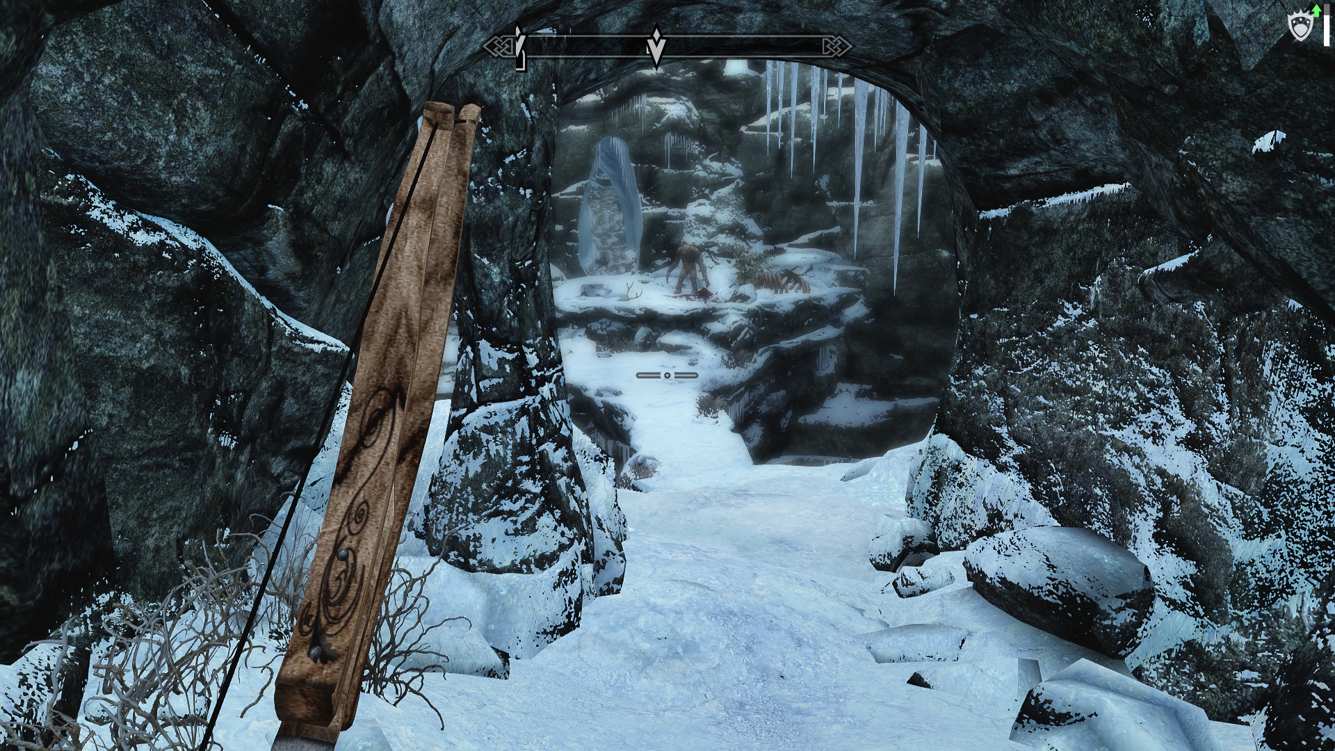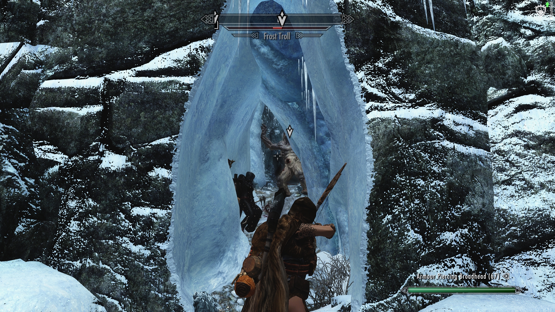 Jenassa is halfway through the crevice when the second frost troll attacks. With no time to use her bow, she immediately reaches for her blades — but with hardly any room for her to swing them around, their effectiveness is significantly hampered. Seeing her predicament, I back straight out of the narrow fissure, then I pull out my own bow and start shooting.