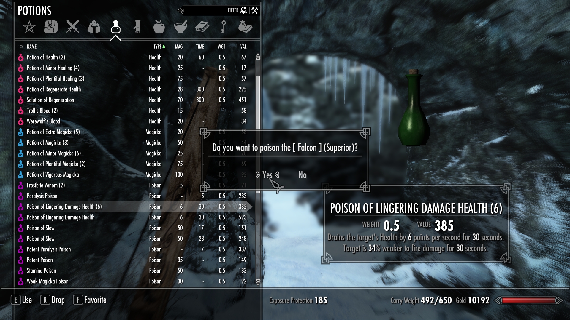 As the alcohol lends me a nice warm glow — and a good bit of false courage — Jenassa and I make our way back over the icy bridge. On the other side, I attempt to harvest something of use from the other dead troll, but in the short time we’ve been here, it’s already frozen solid. Annoyed, I try to kick its corpse into the canyon, but all I manage to do is stub my toe — and then as I’m hopping around in pain, I slip and fall on my arse in the snow.