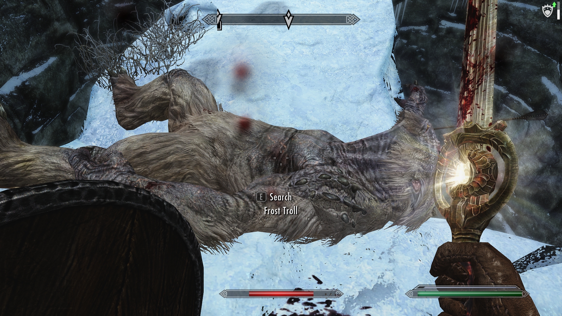 Beyond the frost troll, which is rudely blocking our path even in death, we discover a slightly larger chamber containing the skeletal remains of an unlucky adventurer, with his sword and some of his gear still intact. As I’m busy processing the troll for its thick furry hide and various alchemy ingredients, Jenassa picks through the late adventurer’s belongings to see if there’s anything worth taking.