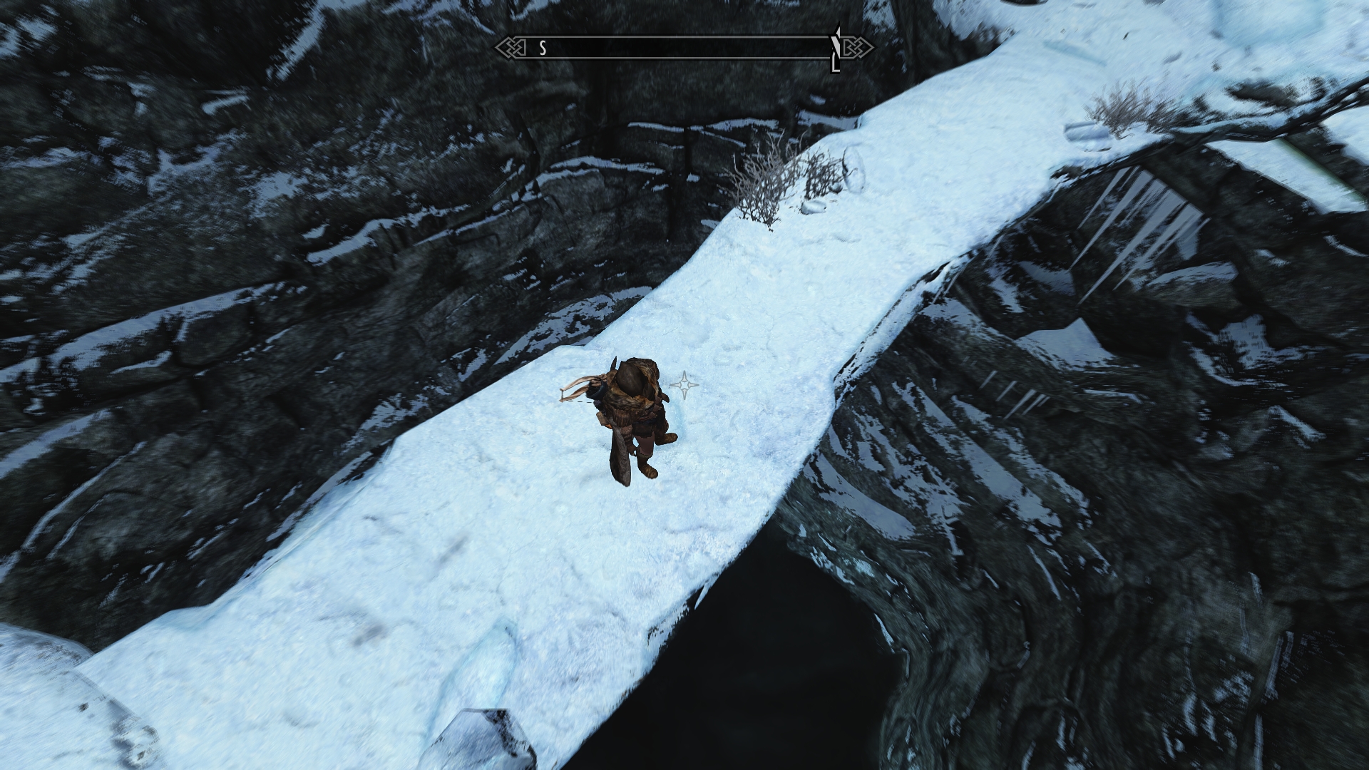 Seeing that I’m being a tad overly-cautious — okay, I’m refusing to budge and I may or may not have squeaked like a mouse — Jenassa comes to my rescue. Reaching for my hand, she carefully steps around me, gently pulling me along the icy bridge after her and murmuring words of loving encouragement. It’s a testament to our bond that I trust her enough to follow her without protest. In this way, we both manage to cross without either of us falling to our untimely deaths.
