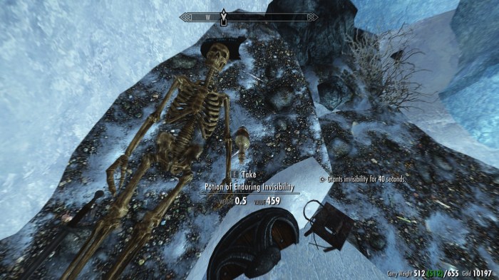 But before I get to that chest, there’s something else I have to do first. As I try to control my shivering hands, I fumble open my backpack, grab a bottle of good strong mead, drain it dry, and immediately chase it with another. With absolutely no warmth to be had, not even from a random torch or a lousy candle, my teeth are already starting to chatter — and I’ll be damned if there’s going to be two skeletons lying on the floor of this bloody frozen hellhole.