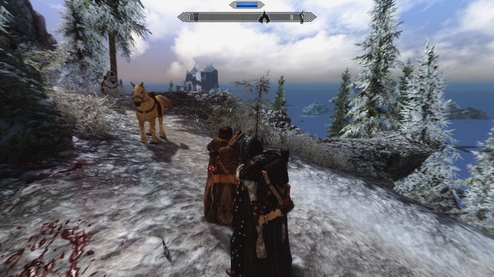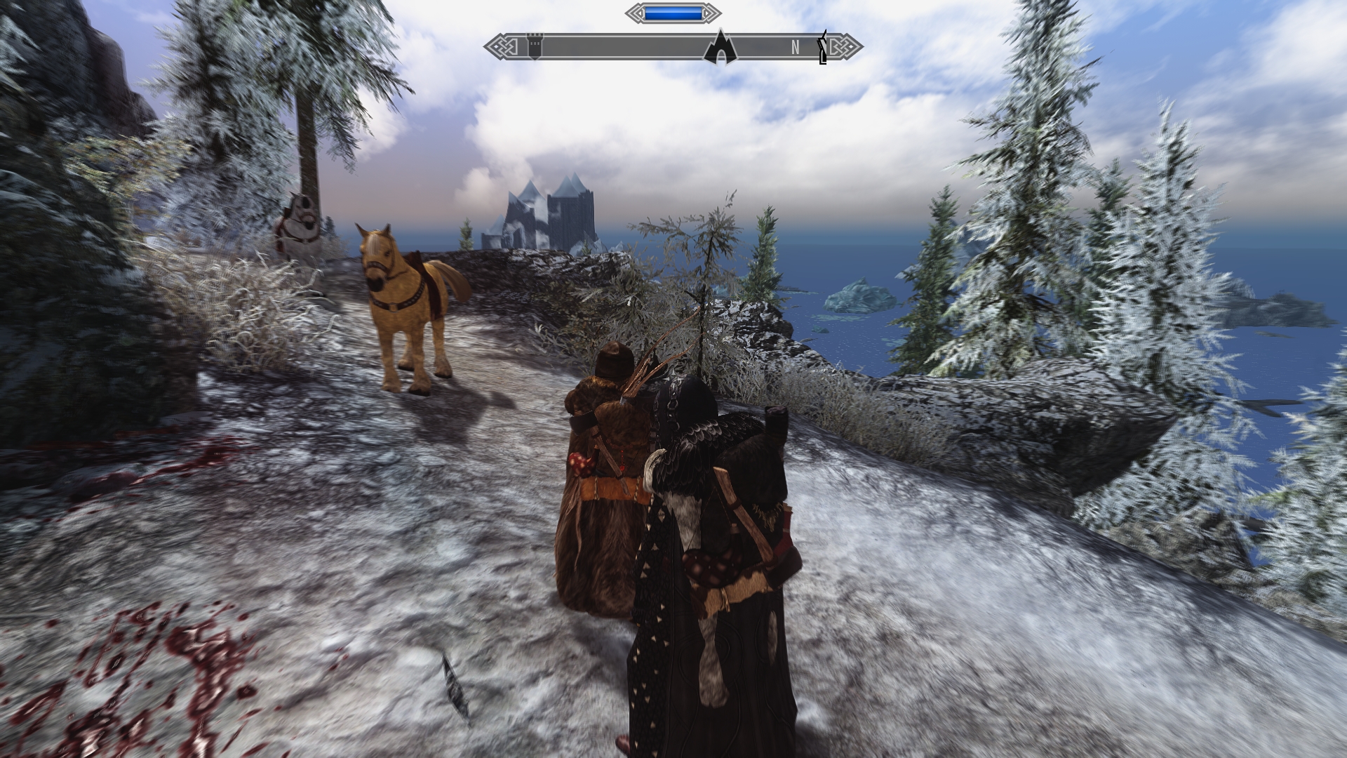 The vivid crimson trail leads us on a winding path through the forest, passing close to a crumbling fortress with a tall tower. As we get closer, I start to reach for my bow, fully expecting a bandit ambush. Call it paranoia, but our adventures in Skyrim have taught me that any building might be occupied by hostile enemies, no matter how abandoned it may seem.