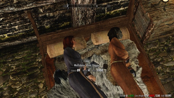 “Because, my love, the only experiences I’ve had with werewolves are those we’ve both had since we’ve been traveling together. And what kind of werewolves have we encountered? The deranged werewolf in the woods near Riften, clearly raving and out of control. Sinding, who disemboweled a little girl, and who even Hircine said was out of control. And you, who I assume became a werewolf after the one in the Rift attacked and bit you — the same werewolf that murdered my former mentor.”