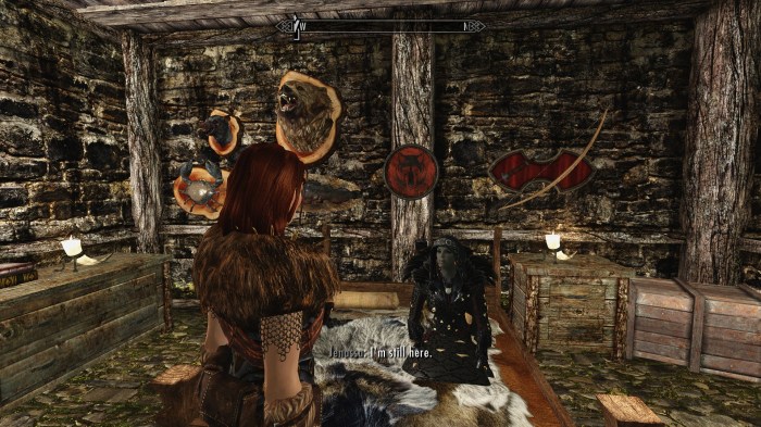 Jenassa nods. “Yes. And both Sinding and Hircine said that the curse caused him to transform without warning, and so Sinding was unable to control his savage impulses. Therefore, we decided he was likely still a danger to others — and it didn’t seem smart to defy a Daedric Prince. For this, Hircine rewarded you with Sinding’s hide — which you have worn ever since.”