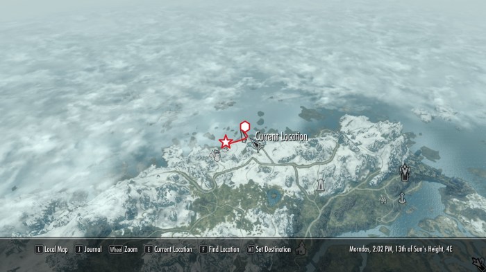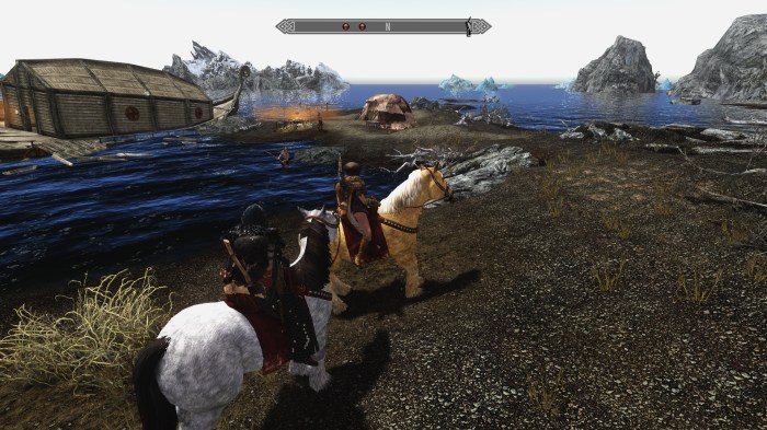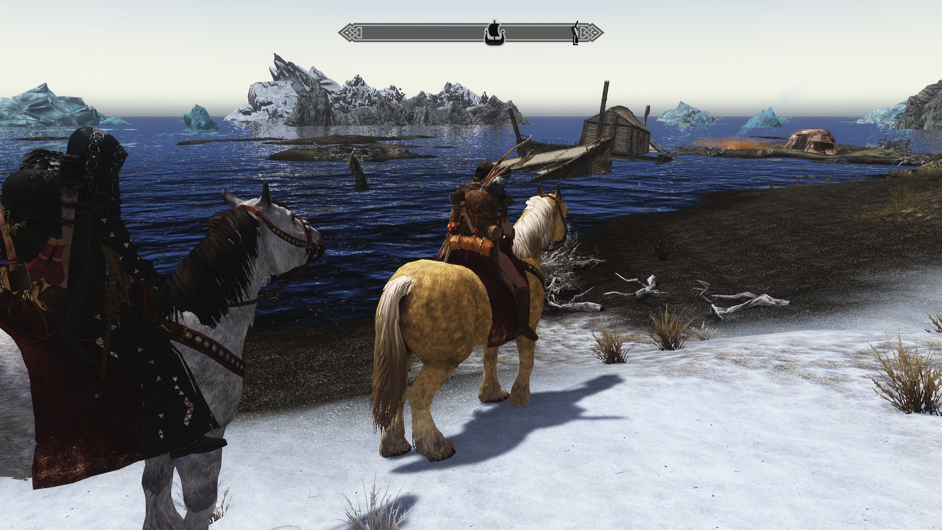 Rolling my eyes, I manage to finish my problematic mouthful while my wife tries, with limited success, to collect herself.  I glance down and see that she’s been busy while she was indoors, as she’s brought out the rest of our gear, neatly organized and ready to go.  I give her a peck on her icy cheek as I grab some things and head over to the stable, loading up the horses and swinging myself into the saddle.  I was half-expecting our mounts to be nothing but frozen slabs of horsemeat in this frigid region, but Frost gives me a contented nicker as if he spent last night back in his cozy stall in Falkreath.