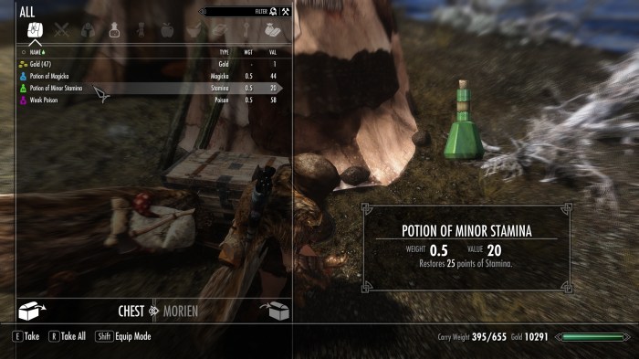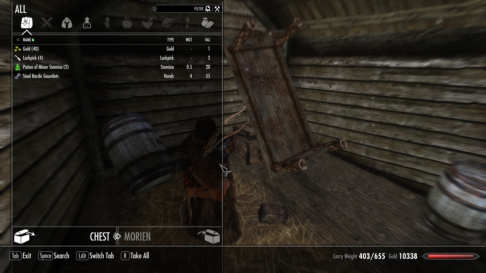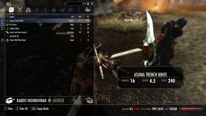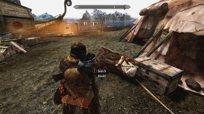 With a heavy sigh, I empty the paltry contents of the chest into my pack and head back out to the beach to rejoin Jenassa.  My wife has been spending the intervening time in stripping dead bandits of their valuables — although calling any of this stuff “valuable” is a stretch.   Aside from the odd weapon and the occasional soul gem, there’s just not much worth taking.   For the most part, we end up leaving much of the available loot right where we found it.