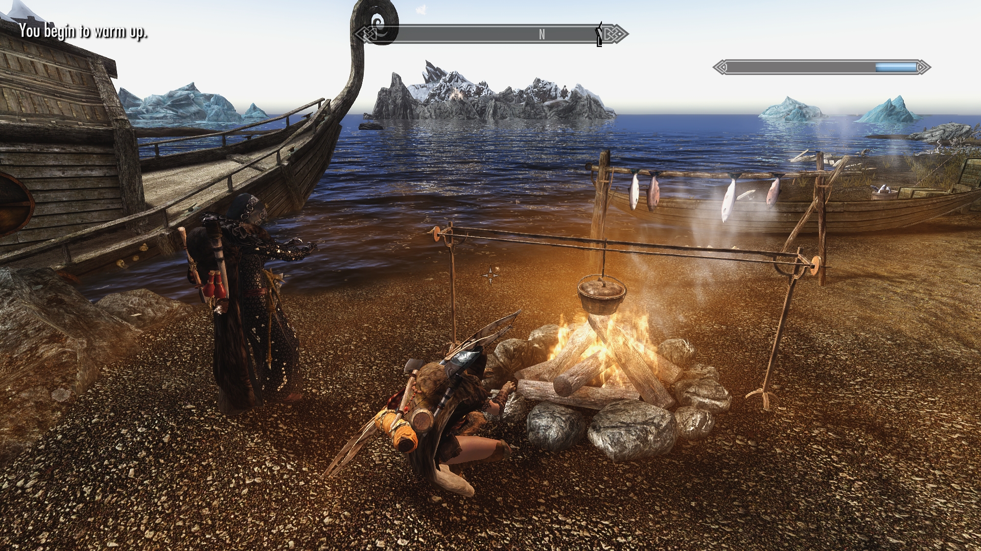 Looking around, I decide to head over to the only other structure in this camp — the shipwreck itself.  I’m seriously hoping there’s a stash of decent loot somewhere on board, or else Jenassa and I just wiped out the most pathetic bandit gang in all of Skyrim.  Of course, it’s also possible that the real treasure is lost somewhere beneath the wreck, resting at the bottom of the Sea of Ghosts — but I’m not willing to immerse myself in that icy ocean in search of it, die of hypothermia, and become just another lonely ghost in the mist of this bitter sea.