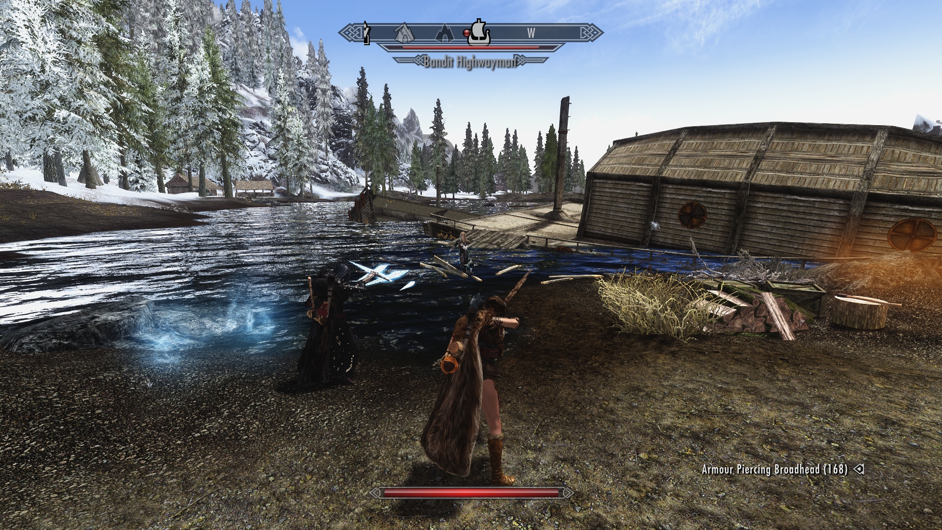 I’m pretty fast when I spin around in a panic, but I’m not nearly as fast as my wife.  Now that the mage is dead, Jenassa has managed to shake off the slowing effect of the frost spell and she’s back in the fray.  In the corner of my eye, my beautiful and badass wife is nothing but a blur as she aims her crossbow and fires.  The bolt whistles past me as I reach for Dawnbreaker, and I see it stagger the bandit just before I attack.  Then, using the momentum of my spin, I swing my blade hard with all the force I can muster.
