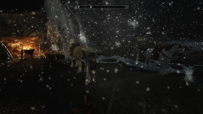 Outside, the icy wind slaps me in the face, shocking me back to a state of wakefulness. Holy sweetrolls, it’s freezing out here — and worse yet, a blizzard has just swept in from the sea. Snow swirls through the air in all directions, making it even harder to see what we’re doing now that it’s pitch dark. Fortunately the horses seem to be taking all this in stride, and I hurriedly transfer items from my pack to the saddlebags, relying primarily on my sense of touch. We take a few moments to tend a couple of firepots — in case the horses need a source of warmth to make it through the night — before rushing back into the cave with a profound sense of relief.