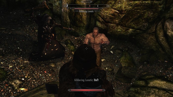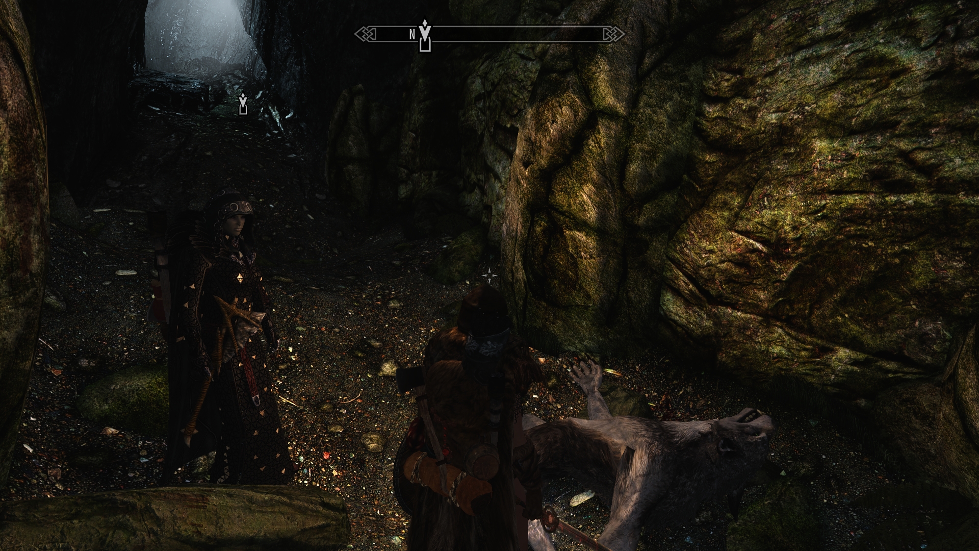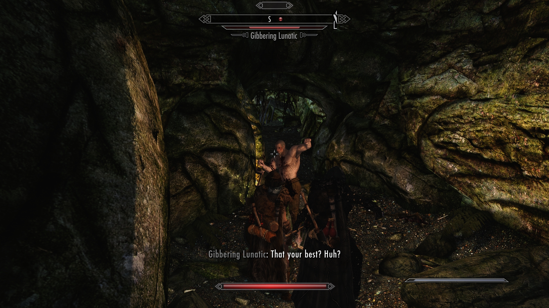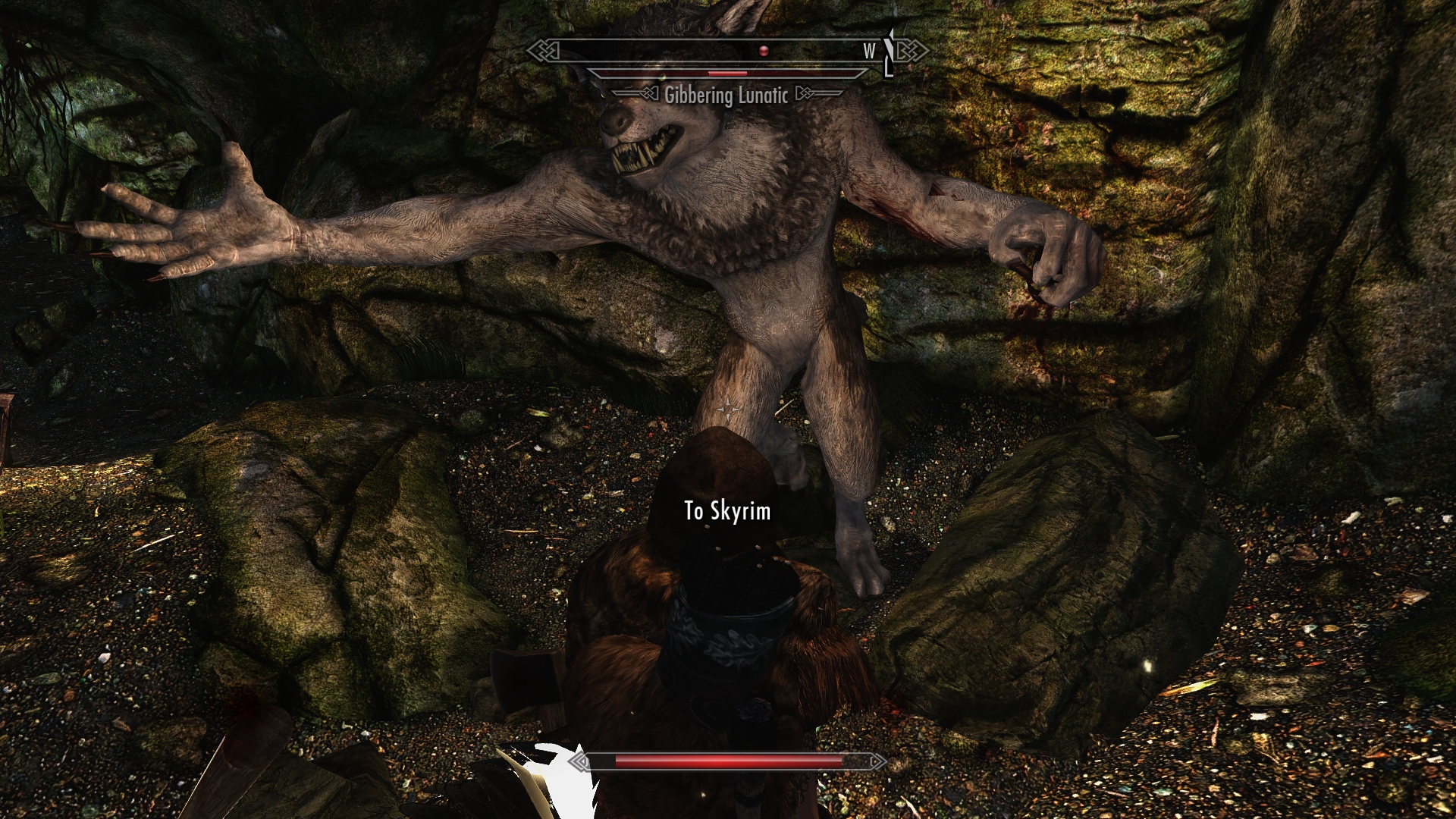 Wasting no time, and muttering a plea to Hircine under my breath, I unsheathe Dawnbreaker and start swinging. Behind me, I can hear my wife switch to her crossbow and bolts. Excellent. The faster we take this maniac down, the better.