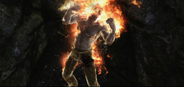 Avoiding the worst of his blows, it’s not long before I set the enemy blazing like a torch, casting a dazzling light on the stone walls and lending a welcome heat to the chilly cave. As I defend myself against his counterattack, Jenassa switches to her crossbow, careful not to take a shot in this narrow space until she knows she can hit the enemy instead of me. Similarly, I force myself to slow down and pace myself, making each strike count and trying not to slash my wife by accident. As a result, landing the killing blow is taking significantly longer than I’d like, and it doesn’t help that werewolves are notoriously tough to take down. That said, as long as we can finish him off before he has a chance to transform, we should be in the clear.
