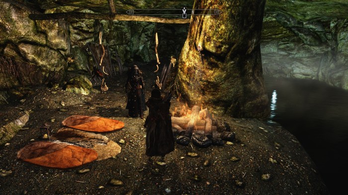 By the time my wife comes back, I’ve set out our bedrolls and started a fire. The campsite is close to the dangling bones, so it’s not the most cheerful location, but it beats sleeping beside a freshly dead werewolf or the other assorted corpses that litter this cave.