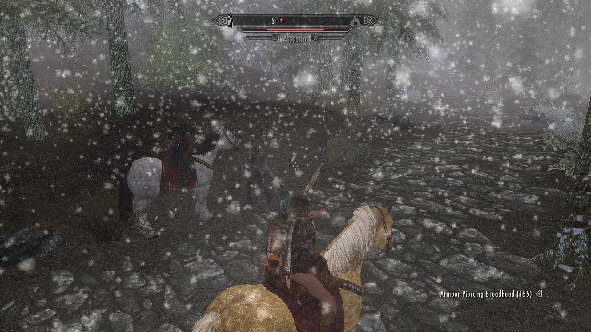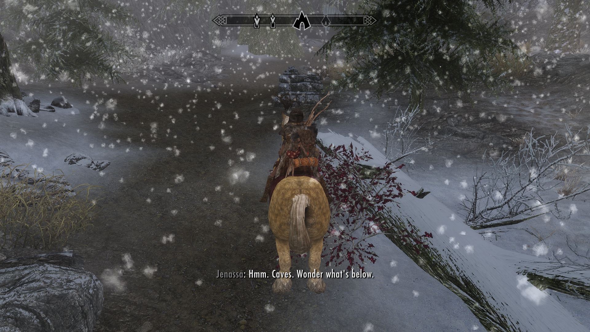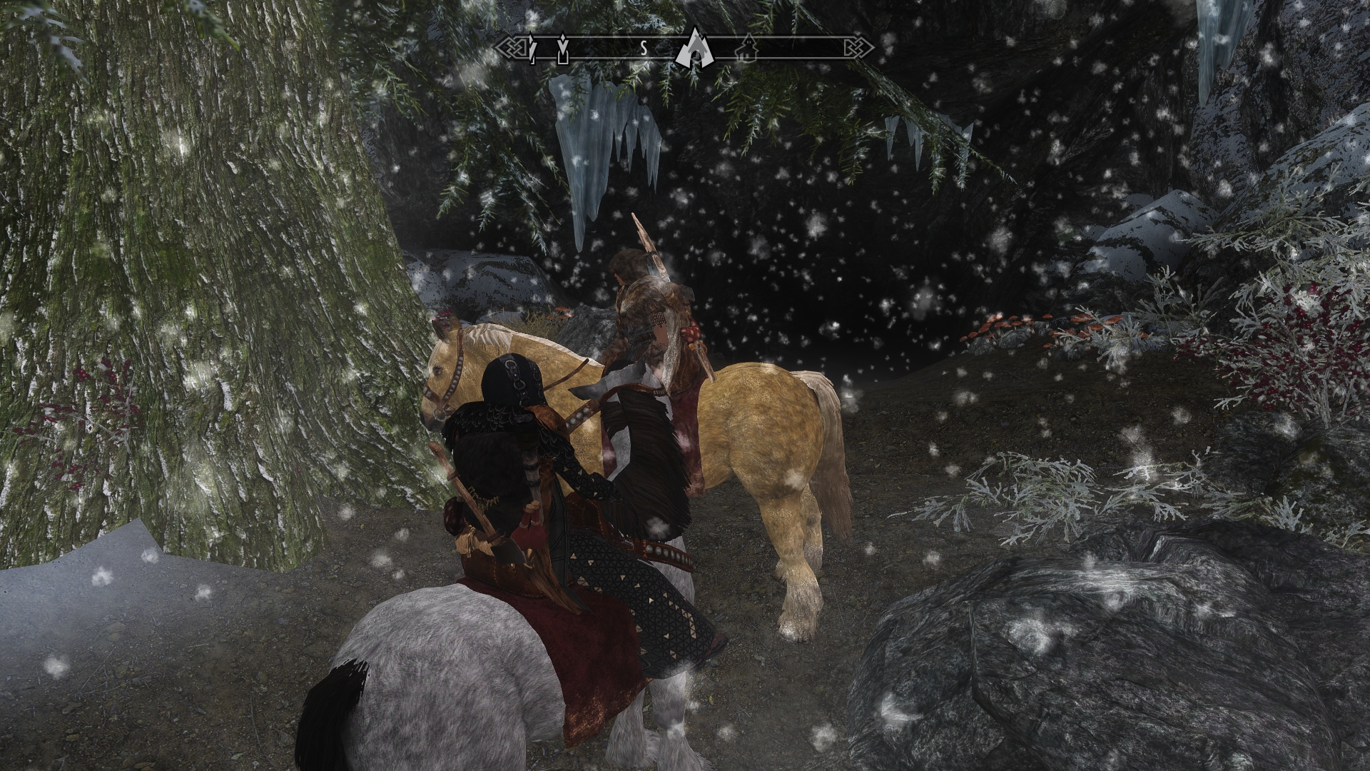 But satisfying as this encounter turns out to be, it does nothing to allay my overall concern. Our situation is becoming dire. The storm is definitely worsening, the temperature is dropping like a rock, and Jenassa admits that she’s doubtful we’ll be able to reach Solitude in this weather. In her view, it’s imperative we try to find some sort of shelter immediately — and ideally it should be large enough to accommodate the horses as well.