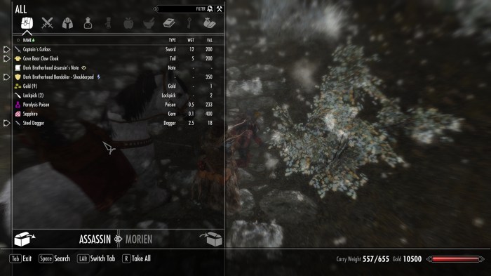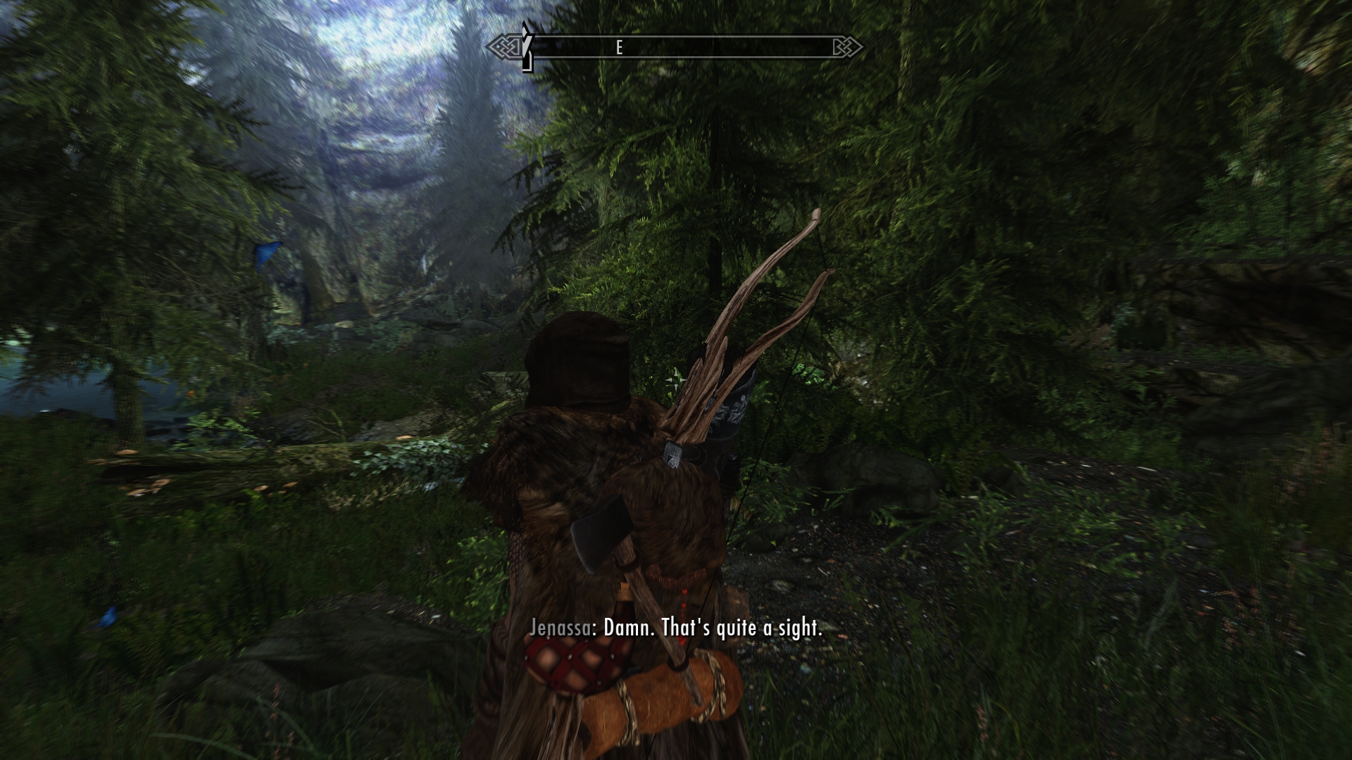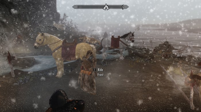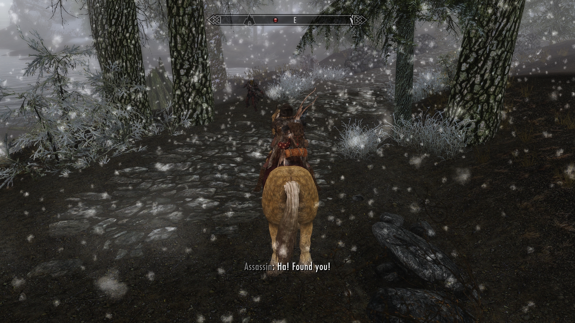 But satisfying as this encounter turns out to be, it does nothing to allay my overall concern. Our situation is becoming dire. The storm is definitely worsening, the temperature is dropping like a rock, and Jenassa admits that she’s doubtful we’ll be able to reach Solitude in this weather. In her view, it’s imperative we try to find some sort of shelter immediately — and ideally it should be large enough to accommodate the horses as well.