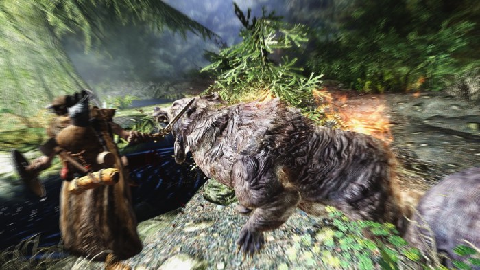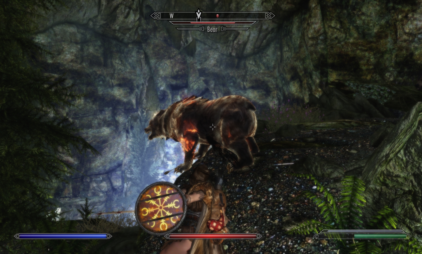 My bow firmly in hand, I’m about to line up a shot — when out of the corner of my eye I catch the barest glimpse of something else in the foliage, and the bear suddenly takes on a bright green glow. Crap. Thinking fast, I ditch the bow, grab my sword, and summon my atronach just as a couple of angry spriggans prepare to attack.