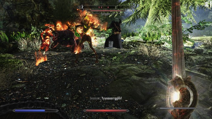 At the same moment, Jenassa and my atronach are just putting the other spriggan out of its misery, when the crazed bear suddenly breaks free from the fight. I’ve hardly set foot back on land when my wife screams out a warning.